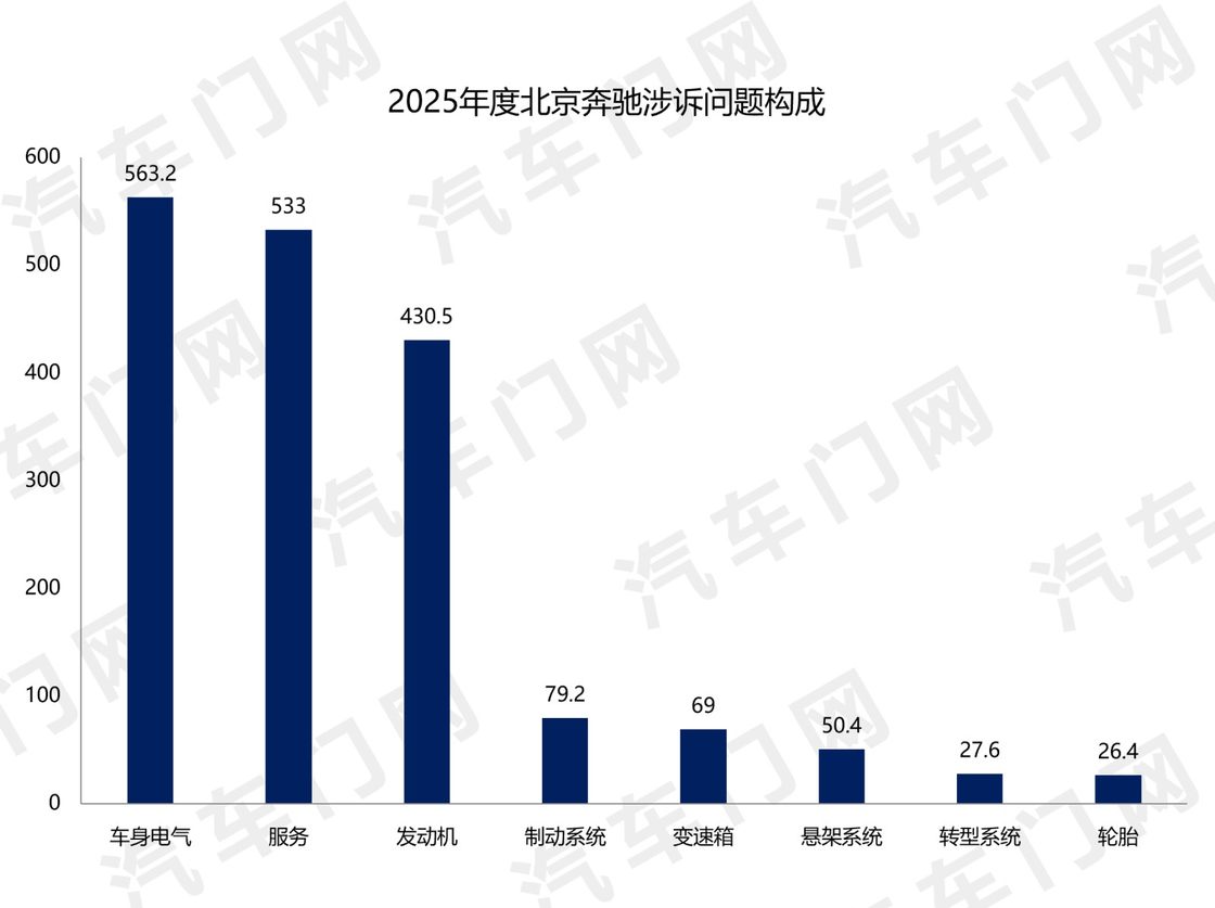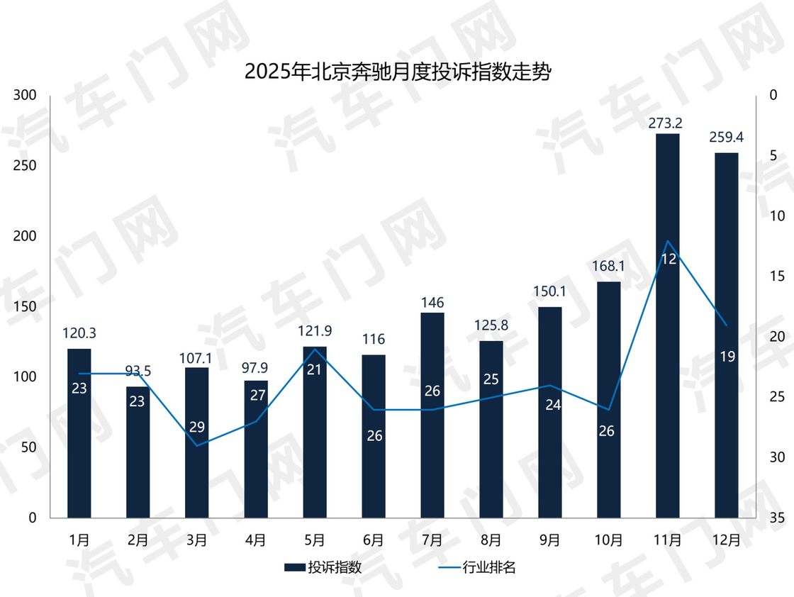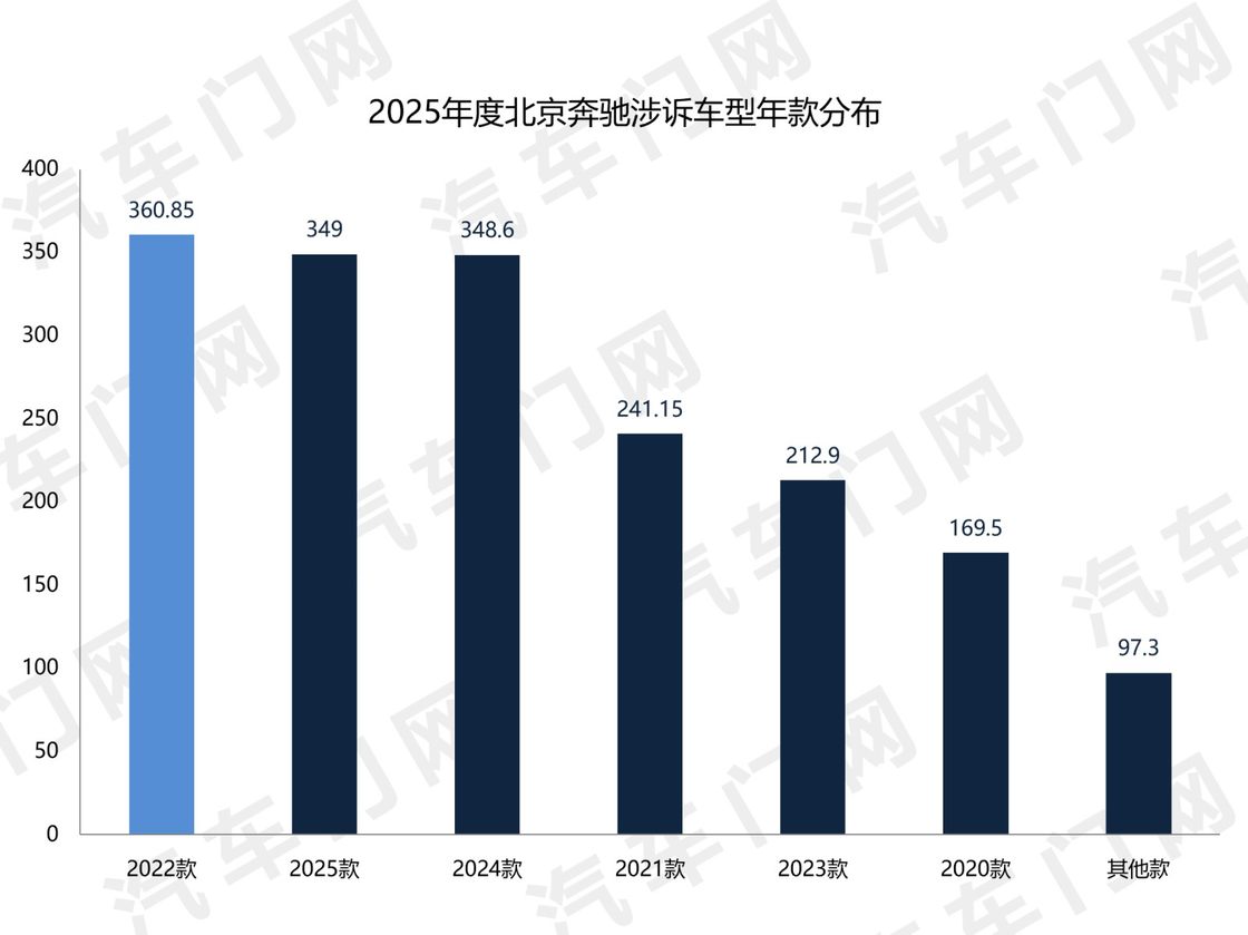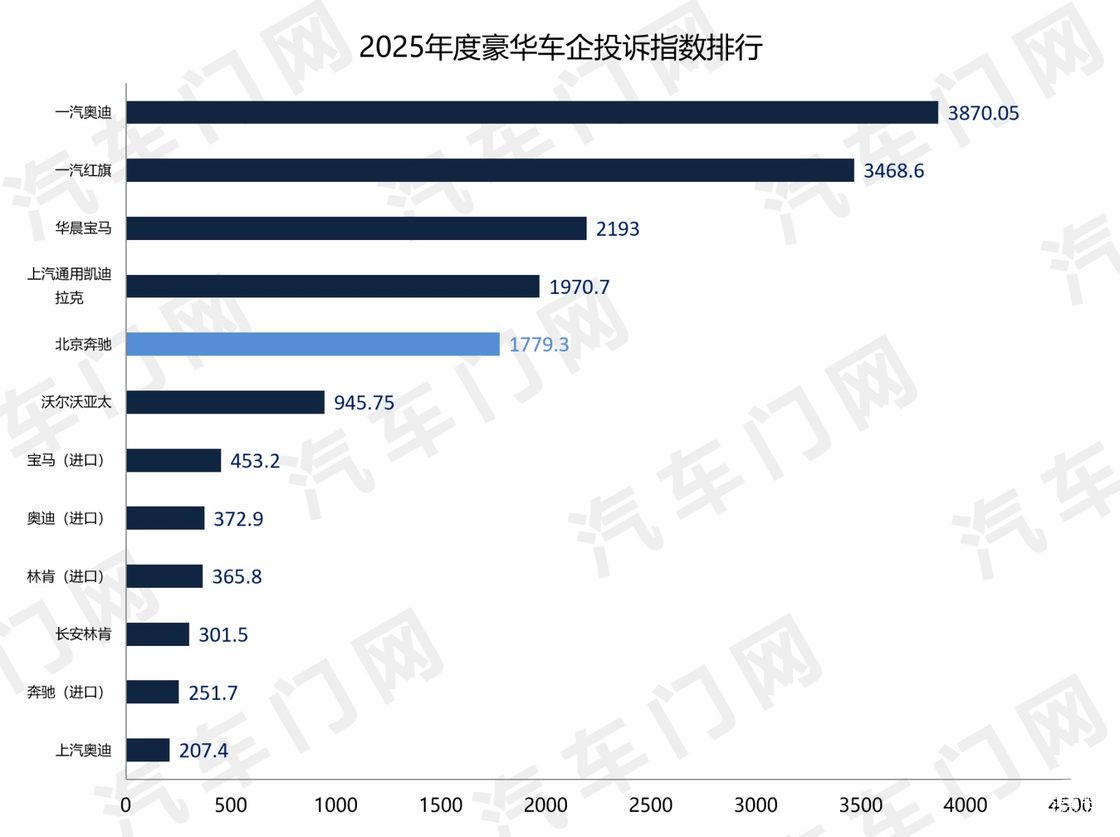 來自汽車門網的數據顯示:2025年,北京奔馳的投訴指數達到了1779.3,同比暴漲332%,位列豪華車企年度投訴榜單第五名。
