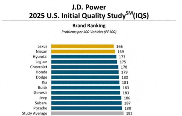 前些日子,大名鼎鼎的J.D.Power發(fā)布了老美那邊的2025新車質(zhì)量調(diào)查榜單,榜單統(tǒng)計(jì)的是新車購買后90天內(nèi)每100輛車出現(xiàn)的問題數(shù)(PP100),數(shù)字越低越好。而榜單上的排名似乎跟咱們想象的有些出入,跟J.D.Power的中國榜單也有些差異。今天漫哥來吹吹水,看看老美那邊哪些品牌的新車更可靠的。