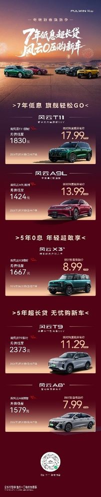 針對不同車型,風云推出個性化金融方案:選購風云A9L可享7年低息,月供低至1424元,這意味著每天不到50元的出行成本,即可擁有一臺旗艦級插混轎車,無論是日常通勤還是家庭出游,都能享受越級舒適;選購風云T11同樣享7年低息,月供低至1830元,每天僅需60元左右,就能讓全家人在新春走親訪友時,體驗到百萬級豪華SUV的寬敞空間與靜謐駕乘。除核心金融禮外,用戶還可疊加享受至高20000元購置稅補貼、2000元新年紅包等限時權益,配合全系車型整車加三電終身質保的長期承諾,真正實現“買得放心、用得安心”。