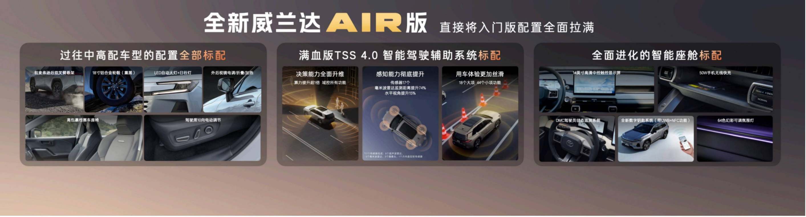 更打破行業(yè)慣例的是,全新?lián)Q代威蘭達AIR版不以“低價=低配”為潛規(guī)則,反而做到了“入門配置拉滿”。以往中高配車型專屬的真皮方向盤、高級皮質(zhì)座椅、外后視鏡折疊加熱、50W無線快充、64色氛圍燈等舒適配置,以及全面進化的智能座艙和油車里最好用的L2級豐田TSS 4.0智能駕駛系統(tǒng),均是標配。這意味著用戶無需在預(yù)算和心儀配置之間艱難抉擇,一步到位即可享受全方位的滿配與科技體驗,徹底告別“套路式選裝”。