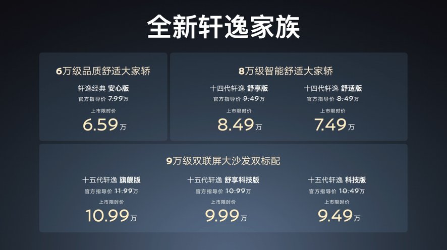 十五代軒逸上市后,與軒逸·經典、十四代軒逸聯袂打造全新軒逸家族,滿足中國家庭多樣化需求。其中,6萬買軒逸?經典,品質純粹,可靠又舒適,安心之選;8萬買十四代軒逸,兼顧智能科技與駕乘質感,舒適之選;9萬買十五代軒逸,雙聯屏大沙發雙標配,定義智能家轎新高度,智慧之選。對于中國家庭來說“選家轎,必有一款軒逸,適合你!”
