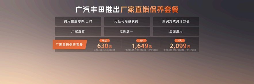 養車環節,廣汽豐田推出“廠家直銷保養套餐”,僅需2099元就能購買4次原廠保養,價格低至市場價七五折,且無隱藏收費。該套餐采用原廠直供零件,遵循全球技術標準保養檢測,全程在廠家授權4S店進行,全國通用,讓養車透明無憂。