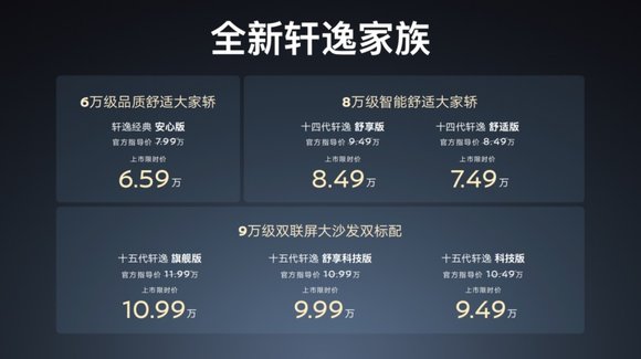 十五代軒逸上市后,與軒逸·經典、十四代軒逸聯袂打造全新軒逸家族,滿足中國家庭多樣化需求。6萬買軒逸?經典;8萬買十四代軒逸;9萬買十五代軒逸,選家轎,必有一款軒逸適合你。