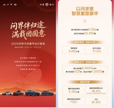 這個春節,問界用數億公里的陪伴,溫暖每一段奔赴團圓的歸途;用7萬余次主動守護,詮釋了“安全是最大的豪華”;用春節不打烊的服務,讓用戶出行更省心、舒心和開心。智慧護航歸途,愛意照亮前路,展望2026,問界汽車將攜手每一位用戶,持續探索智慧出行新體驗,與萬千家庭共赴美好新程。