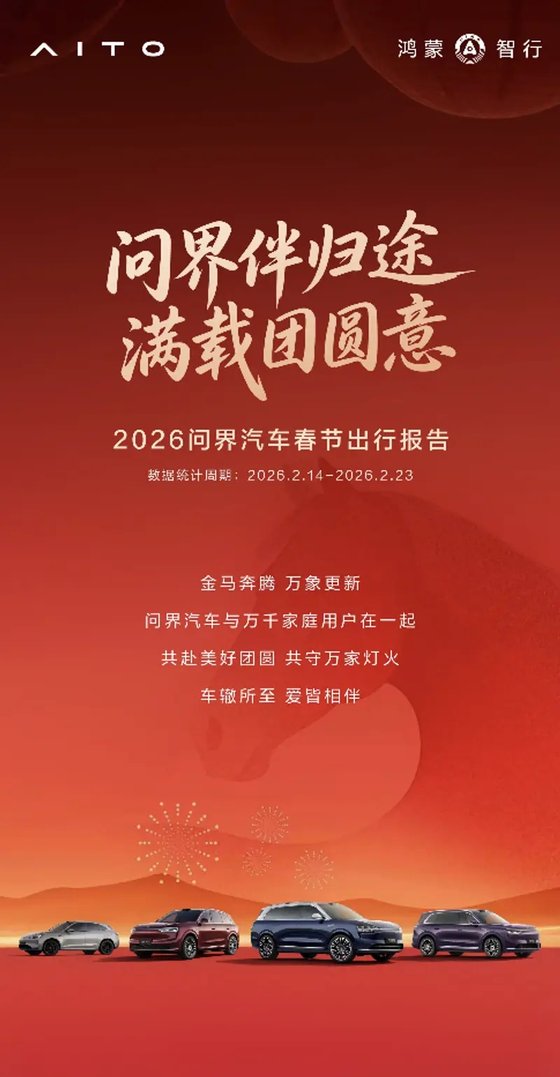 這個春節,問界用數億公里的陪伴,溫暖每一段奔赴團圓的歸途;用7萬余次主動守護,詮釋了“安全是最大的豪華”;用春節不打烊的服務,讓用戶出行更省心、舒心和開心。智慧護航歸途,愛意照亮前路,展望2026,問界汽車將攜手每一位用戶,持續探索智慧出行新體驗,與萬千家庭共赴美好新程。