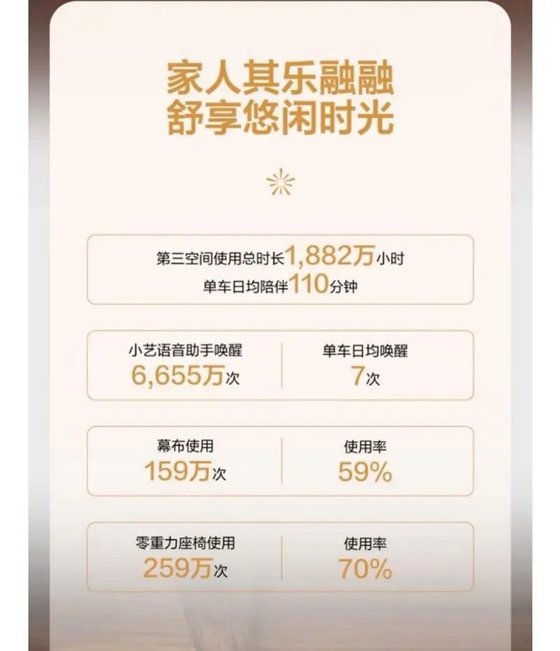 行無界,愛有家,春節期間,問界智能座艙化身溫馨的“第三空間”,用戶累計在第三空間使用總時長1,882萬小時,單車日均陪伴110分鐘。其中,智能語音助手“小藝”被喚醒6,655萬次,單車日均喚醒7次。幕布使用159萬次,使用率達59%,零重力座椅累計使用259萬次,使用率高達70%。