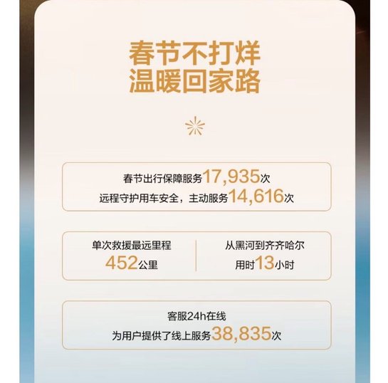 春節期間,問界共提供出行保障服務17,935次;遠程守護用車安全,主動服務14,616次,將許多潛在故障消弭于無形。客服中心24小時在線,為用戶提供了線上服務38,835次。為保障用戶在遭遇緊急情況時能獲得及時且高效的援助,問界服務網絡展現了強大的跨區域協同能力,單次救援最遠里程452公里,從黑河到齊齊哈爾用時13小時,樹立了新豪華服務標桿。