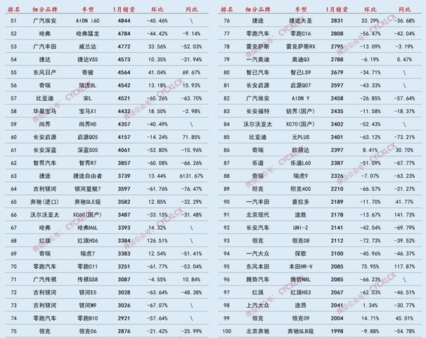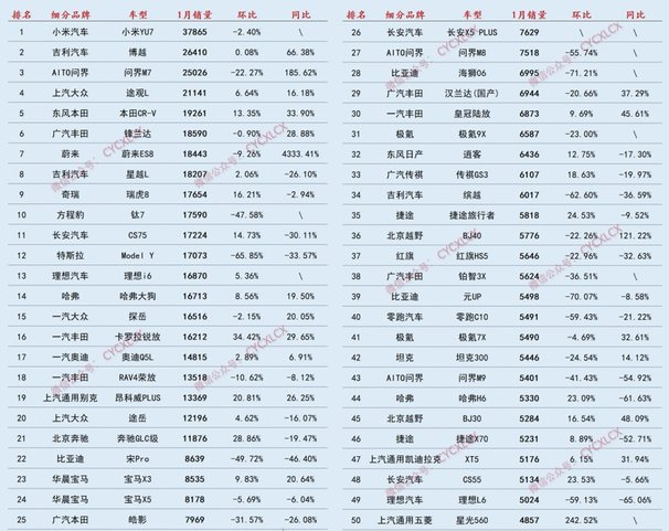 1月SUV終端銷量百強:新勢力漲瘋了,油車博越、CR-V領跑