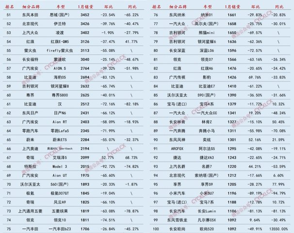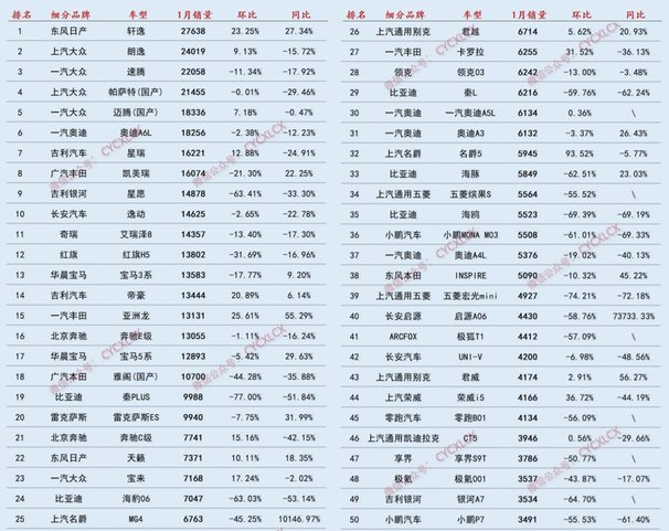 1月轎車終端銷量百強:前十新能源僅一款,合資油車統治前六