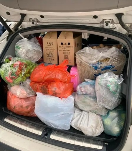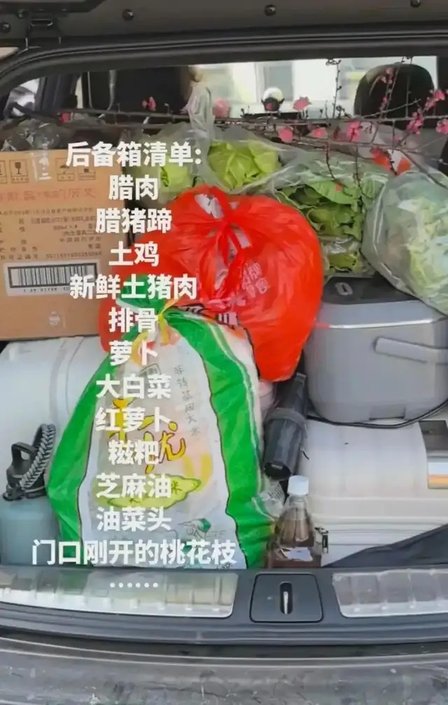 一位山東的網友,他的SUV后備廂里塞著兩紙箱土雞蛋、十斤新米、各種塑料保鮮盒裝的酥肉、鹵牛肉、肉丸子,還有兩盒凍好的餃子。縫隙里塞著木耳、香菇、自家曬的蘿卜干,一罐自制辣椒醬擠在角落,紅油幾乎要溢出來。副駕駛座位上還放著兩棵大白菜、一把蒜苗、幾根萵筍,用舊床單包著。