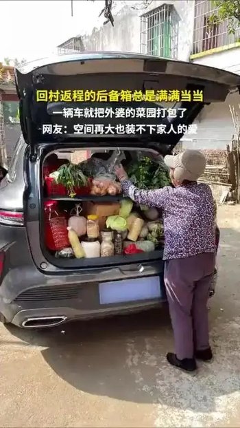 一位網友分享的視頻顯示,車輛后備廂被外婆塞得滿滿當當,仿佛將整個菜園“打包”帶走。另一位網友感慨:“年過完了,又是滿滿一后備廂,感覺明年要換輛卡車來了”。