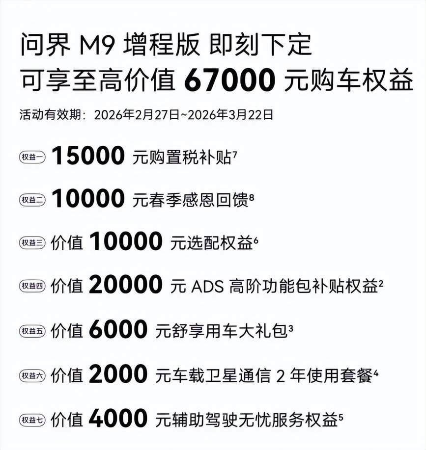 值此春日出行季,問界M9更推出限時購車重磅禮遇。即日起至3月22日,下定問界M9至高可享87000元購車權益,涵蓋購置稅補貼、春季感恩回饋及ADS高階功能包補貼等多重福利,以真金白銀的優惠,讓觸手可及的科技豪華,陪伴每一位用戶奔赴春日山海,解鎖更多出行美好。