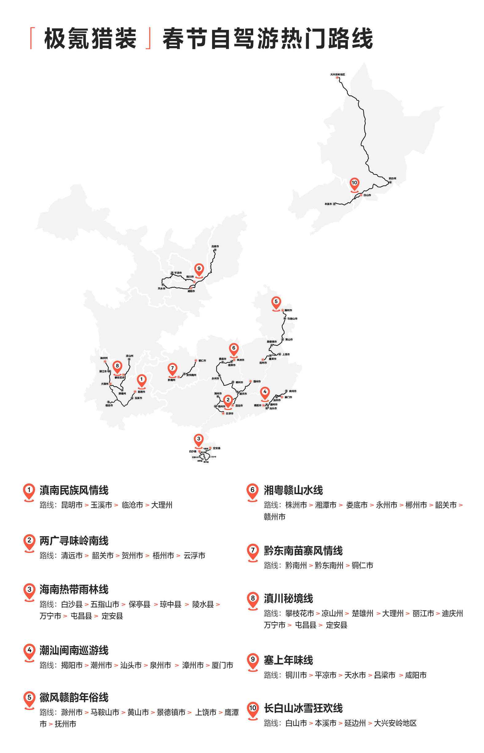 本次公布的十大路線貫穿我國東西南北,覆蓋多元地貌與人文場景,從熱帶雨林到雪域高原,從美食體驗到民族風情,其中包括滇南民族風情線、潮汕閩南巡游線、黔東南苗寨風情線、塞上年味線等,每條路線不僅適配獵裝車,也適合普遍的純電車型,兼顧路況適應性與旅行體驗感。
