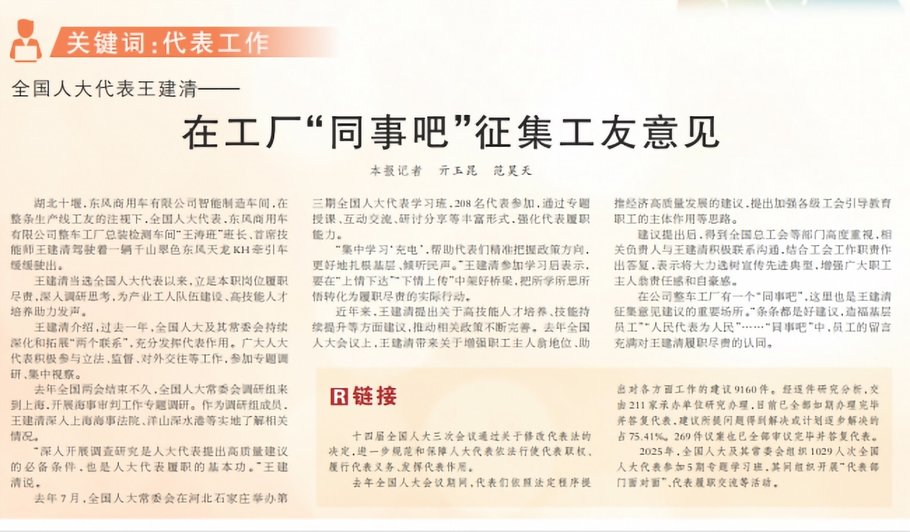 當選全國人大代表以來,王建清始終立足東風產業工人崗位,將履職之根深深扎在基層。他把東風車間當作履職陣地,把工友心聲當作履職方向,東風商用車有限公司整車工廠的“同事吧”成為他征集意見建議的重要平臺。在這里,他收集一線工友的所思所想、所盼所求,短短幾天的意見征集帖便能達到90%以上的工廠閱讀率,超兩千人次參與回帖,數項高質量建議均源于此,工友們“條條都是好建議,造?;鶎訂T工”的留言,是對他履職工作最真切的認可。