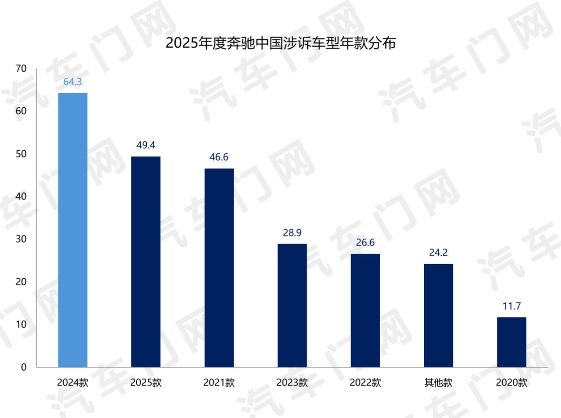 從投訴年款來(lái)看,2024款車(chē)型是奔馳中國(guó)投訴“重災(zāi)區(qū)”,投訴指數(shù)占比達(dá)26%。此外,2025款和2021款車(chē)型的投訴量也相對(duì)較高,合計(jì)投訴占比38%。