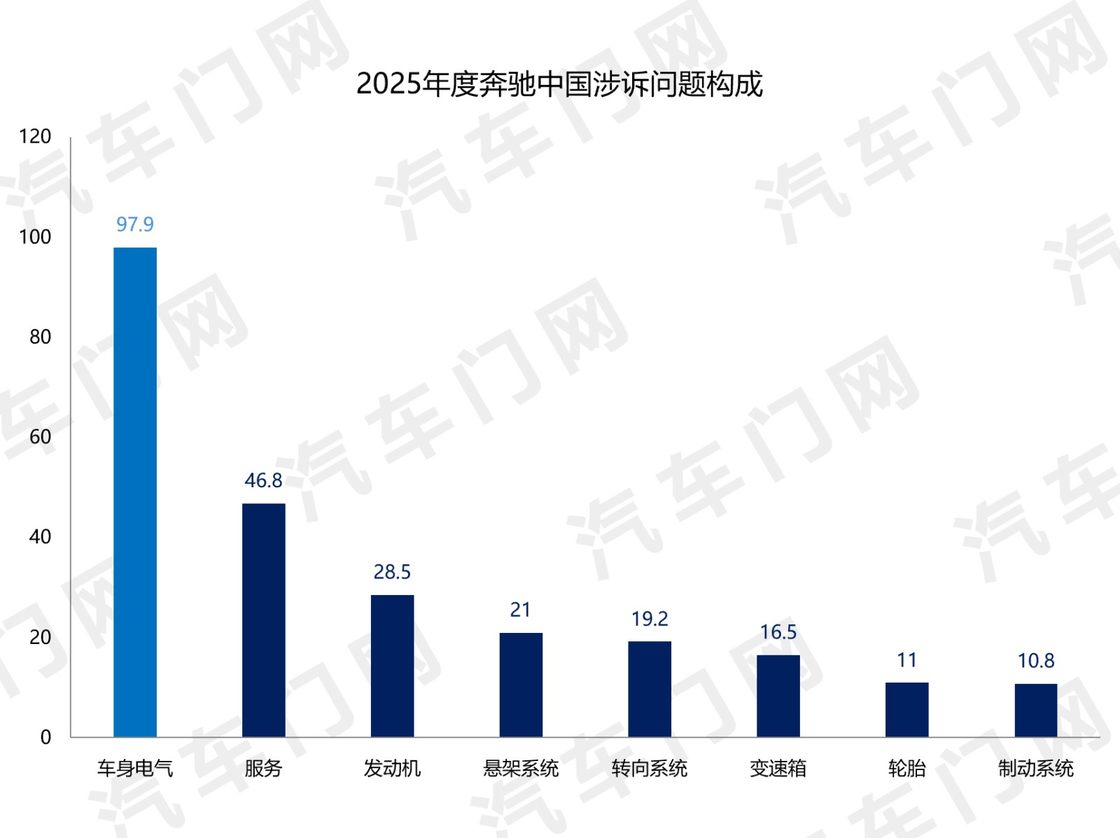 從投訴問(wèn)題來(lái)看,車(chē)身電氣是奔馳中國(guó)面臨的最突出質(zhì)量痛點(diǎn),占比接近整體投訴指數(shù)的1/3。緊隨其后的是奔馳中國(guó)的服務(wù)問(wèn)題,投訴指數(shù)達(dá)到了46.8,占比19%。此外,發(fā)動(dòng)機(jī)問(wèn)題也有車(chē)主在投訴,占比11%。
