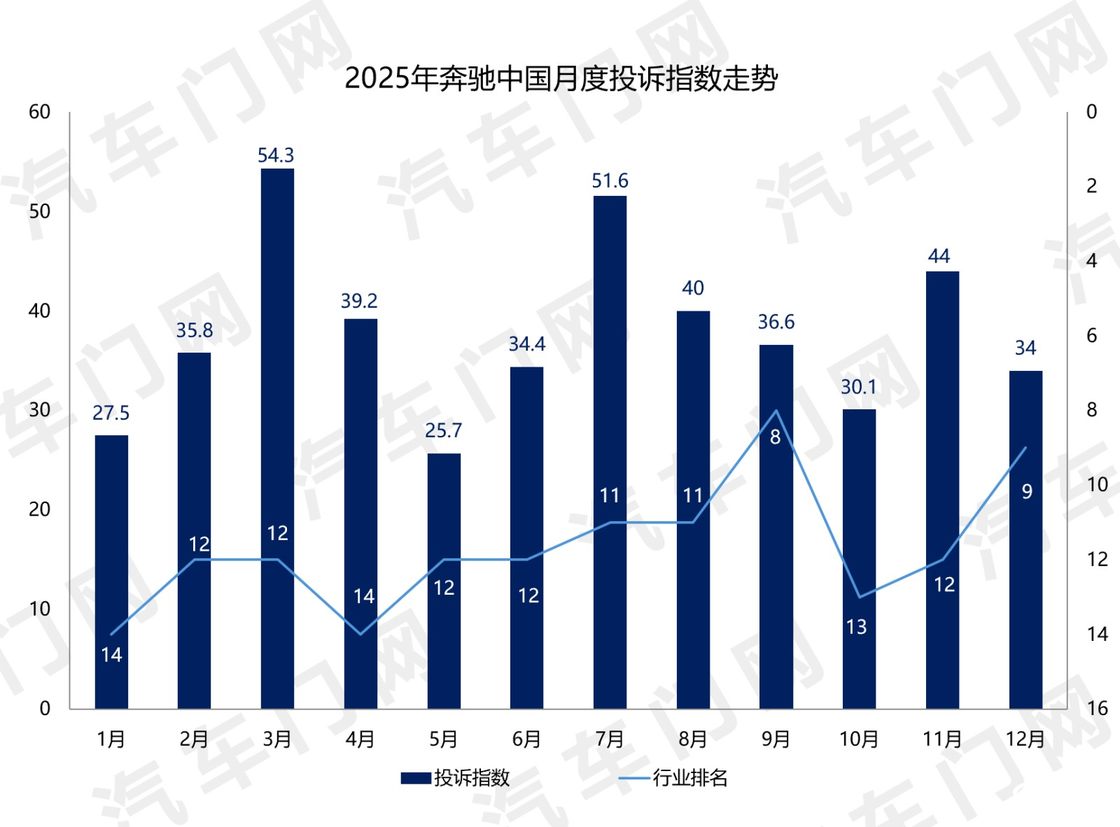 來(lái)自汽車(chē)門(mén)網(wǎng)的數(shù)據(jù)顯示:2025年,奔馳中國(guó)的投訴指數(shù)為251.7,同比下滑了15%,居于豪華車(chē)企年度投訴榜單的第十一名。值得一提的是,盡管奔馳中國(guó)的投訴指數(shù)有所下降,但在投訴響應(yīng)效率、問(wèn)題處理態(tài)度以及后續(xù)跟進(jìn)落實(shí)等環(huán)節(jié),依然存在較為突出的問(wèn)題。