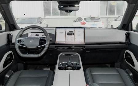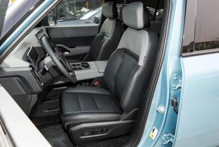 座艙內部,與福特烈馬截然不同,采用了國內新能源車常見的簡約風格,當然在空間與功能上還是很有看點。雙色儀表臺頂部有很好的環繞效果,出風口造型與臺面也很協調。數字交互上,提供15.6英寸2.5K中控大屏、8.8英寸全液晶儀表屏,還有70英寸的超大HUD抬頭顯示和流媒體內后視鏡。提供懷擋式電子檔位,扶手臺全部用來儲物,雙手機位帶50W無線充,雙杯架,還保留了實體控制旋鈕,后方對開式扶手箱,高配車新內部是車載冰箱。