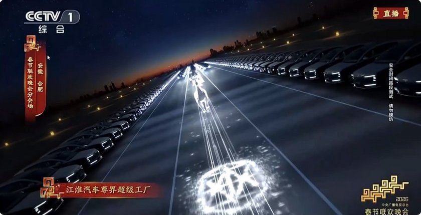 2月16日,癸巳馬年央視春晚的合肥駱崗中央公園,一場科技與藝術交融的光影大秀正在上演:數十輛尊界S800組成的智能無人車隊以整齊劃一的隊列穿行于駱崗公園大道,車隊完成起步、協同串行,最終平穩匯入燈光投影區。
