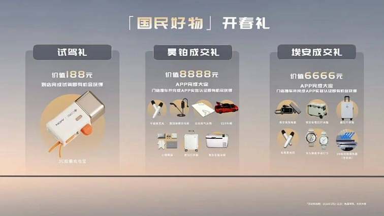 此次煥新發布的三大國民系列IP及多款“好物”看似無“車”,但均以購車用戶為中心:3月將至,消費者在昊鉑或埃安銷售門店完成試乘試駕即有機會獲得價值188元的“國民好物試駕禮”,完成下定即有機會獲得價值8888元或6666元的“國民好物成交大禮包”。