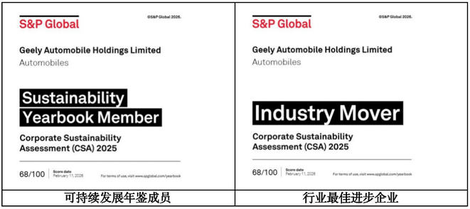 獨家入選!吉利汽車入選標普全球《全球可持續發展年鑒2026》