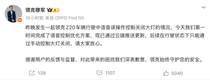 2月26日當天,領克汽車銷售有限公司副總經理穆軍在個人微博公開回應:“今天我們第一時間完成了語音控制優化方案,現已通過云端推送更新,后續在行駛狀態下只能通過手動控制大燈關閉?!?nbsp;