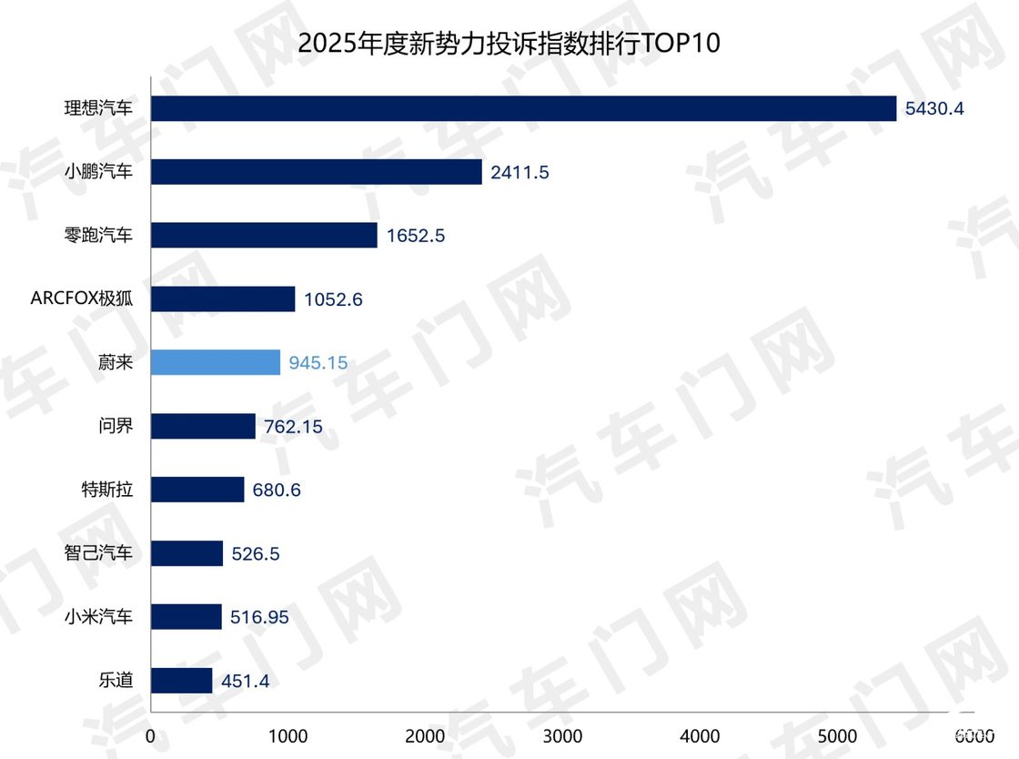 來自汽車門網(wǎng)的數(shù)據(jù)顯示:2025年,蔚來汽車的投訴指數(shù)達(dá)到了945.15,同比漲超2倍,位居新勢(shì)力投訴指數(shù)排行的第五名。