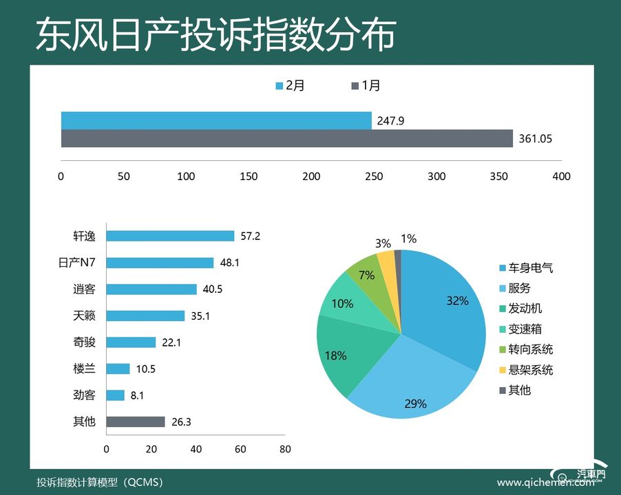 汽車質量投訴點評:本月,東風日產的投訴指數環比下降了三成,幾個投訴較為集中的問題投訴聲量都大幅減弱,也未出現新的集中投訴。從投訴反饋來看,東風日產的問題表現還是比較突出的。發動機故障燈亮和變速箱無法換擋都遭到了多位用戶的投訴。據反饋,上述問題已經出現了多次。我們也希望東風日產能夠妥善解決車主的用車困擾。
