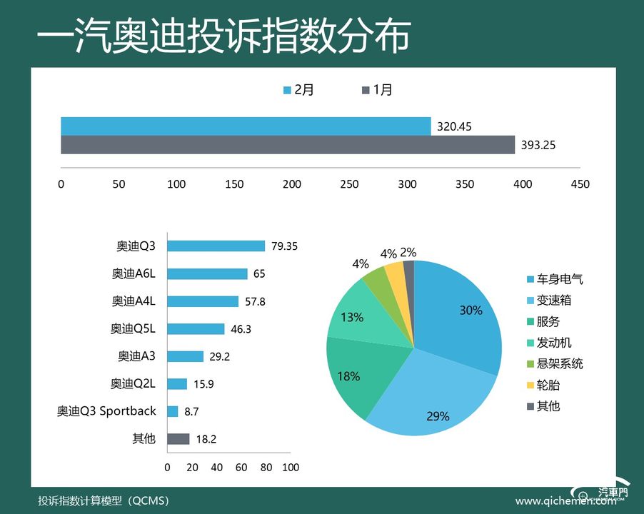 汽車質量投訴點評:由于上個也榜單前列的車企投訴指數攜手下降,一汽奧迪沖到了本月投訴榜的第三位。不過,一汽奧迪的投訴指數只有320.45,沒有新增集中投訴出現。變速箱電腦板故障仍然是用戶的主要槽點。奧迪Q3和奧迪A3是兩大重點吐槽對象。