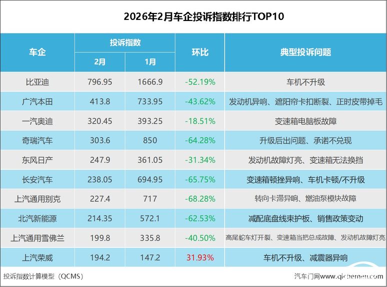 2026年2月車企投訴指數排行:春節假期投訴大幅減少