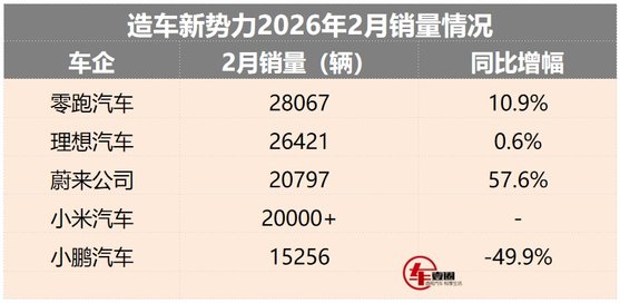 日前,小米、零跑等頭部造車新勢力先后公布了2月份的銷量情況。給大家劃一下重點:零跑單月超2.8萬輛,奪得銷冠;理想雖同比微增,但沖進前二。蔚來增速最猛,小米因SU7停產受拖累。而小鵬銷量同比跌幅近一半,持續承壓。下面,一起來看看具體的情況吧。