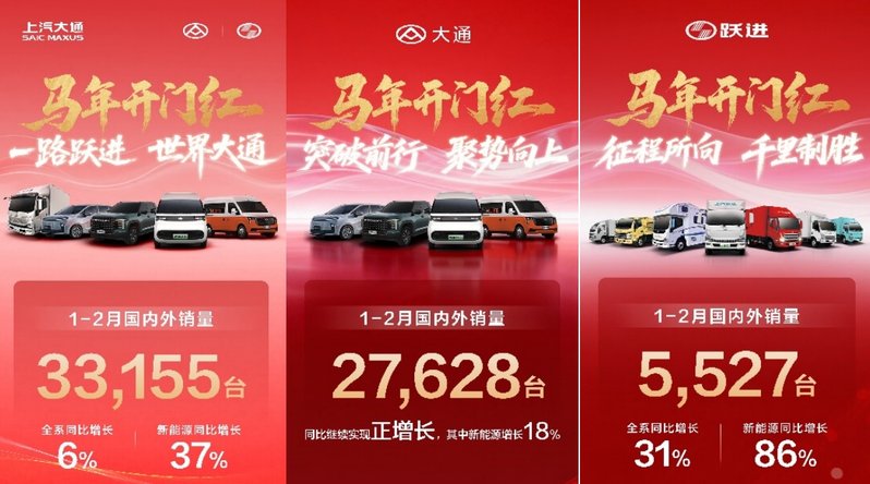 馬年開門紅,上汽大通1-2月全系熱銷超3.3萬輛,同比繼續正增長,沖勁十足。輕客、輕卡、皮卡三線領跑,新能源轉型與全球化布局持續提速:新能源銷量同比增長37%,海外熱銷18,063輛,同比增長11%,連獲澳新兩地大單;輕客1月市占率奪冠,2月新能源“創富神車”大拿V1(寧德天行電池50度)新車上市再添增長引擎;躍進新能源輕卡1月市占率登頂后深化綠色智慧電卡生態布局;皮卡1月同環比雙增領漲國內細分市場,2月持續穩固高端出口第一。