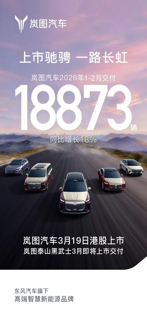 3月1日,嵐圖汽車發布銷量數據,1-2月交付18873輛,同比增長18%,以強勁增長迎來馬年“開門紅”,展現出蓬勃發展活力。3月,嵐圖將迎來多個里程碑時刻。3月19日,嵐圖預計在香港聯交所主板正式掛牌上市,成為“央國企高端新能源第一股”。隨著“產品大年”拉開序幕,嵐圖夢想家即將達成第20萬輛,攜手華為打造的嵐圖夢想家冠軍版已正式開啟預訂;嵐圖泰山黑武士也將在3月正式上市,Ultra版同步開啟交付。
