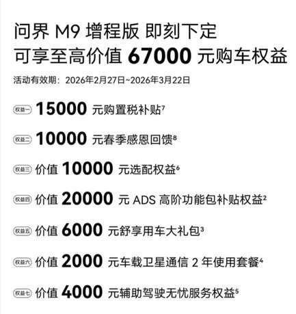 如今,馬年新春已過,但問界M9的暖情福利回饋仍在延續,為了讓更多家庭體驗到科技豪華的出行生活,問界M9推出限時購車重磅禮遇。2026年3月22日前,下定問界M9至高可享87000元購車權益,涵蓋購置稅補貼、春季感恩回饋、ADS高階功能包補貼、車載衛星通信2年使用套餐等多重禮遇。