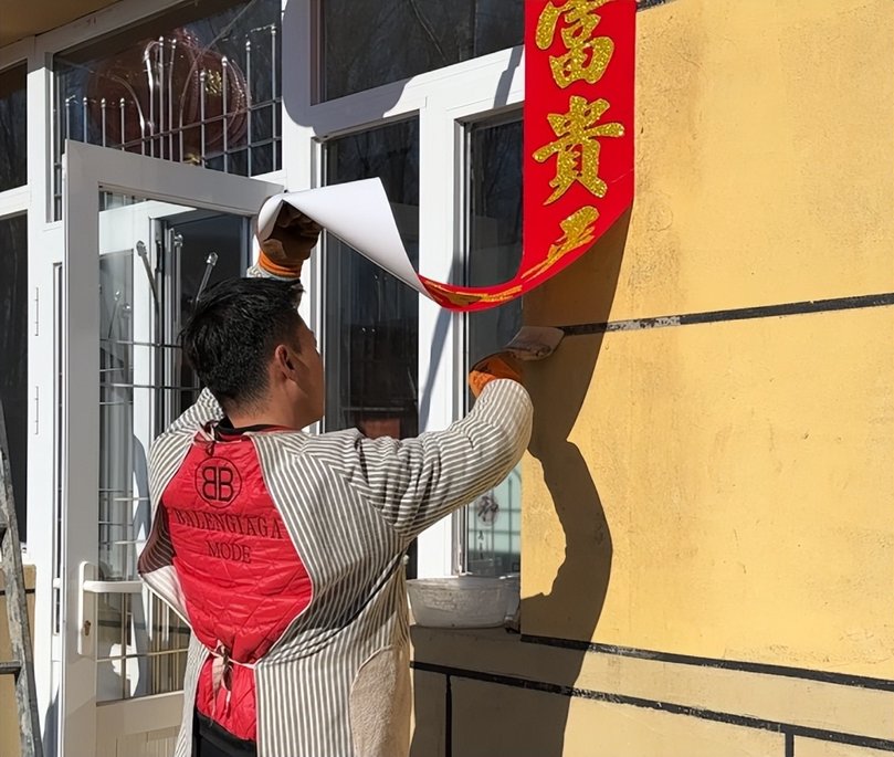 臘月三十,貼春聯是必不可少的一項,傳統方法的煳漿子(面粉和溫水融合)在墻上反復刷著,只為了將春聯更結實的貼合在墻面上。