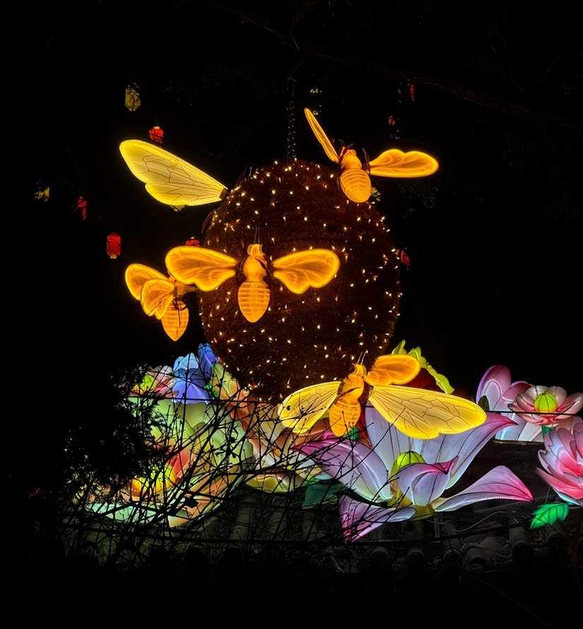 牽著妻兒的手踏入燈會,慕容街的上空,“朝陽花開”與“年年有魚”的巨型彩燈天幕橫跨街巷,錦鯉光影緩緩游動。兒子奔向“鳳羽宮燈陣”,九組七彩宮燈暗合“九鳳朝陽”的寓意,他踮著腳尖數燈,小臉蛋映著暖光,像個發光的小湯圓。