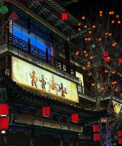 剪紙樓的光影流轉,非遺民俗圖景徐徐鋪展;皮影樓前,老藝人的指尖翻飛,驢皮人物演繹著《西游記》選段,唱腔悠揚穿透人群。我們坐在北塔廣場的長椅上,看著眼前的燈火輝煌,聽著身邊的歡聲笑語,忽然覺得,這就是幸福最真實的模樣。