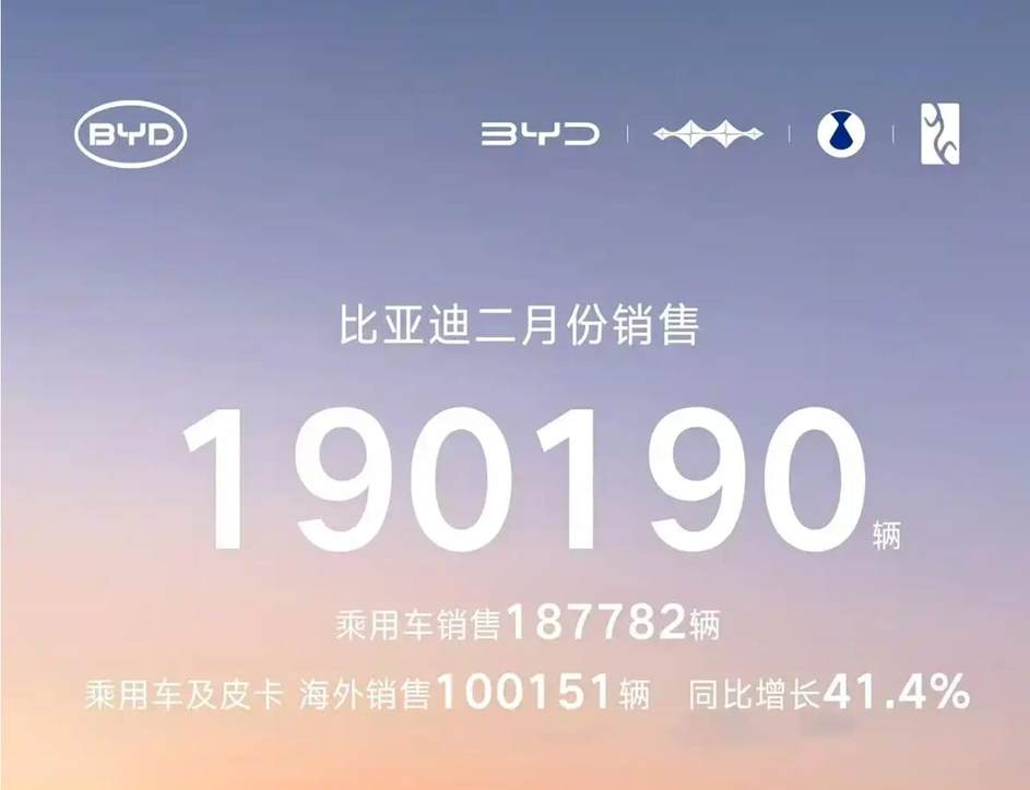 比亞迪2月份銷量達到190190輛,其中,王朝/海洋銷量為165013輛;方程豹賣出17036輛;騰勢達到5501輛;值得一提的是,乘用車及皮卡海外銷售100151輛,同比增長41.4%。跟國內對手相比,比亞迪汽車在海外市場布局的速度更快,有點國內“開花”國外“香”的意思。