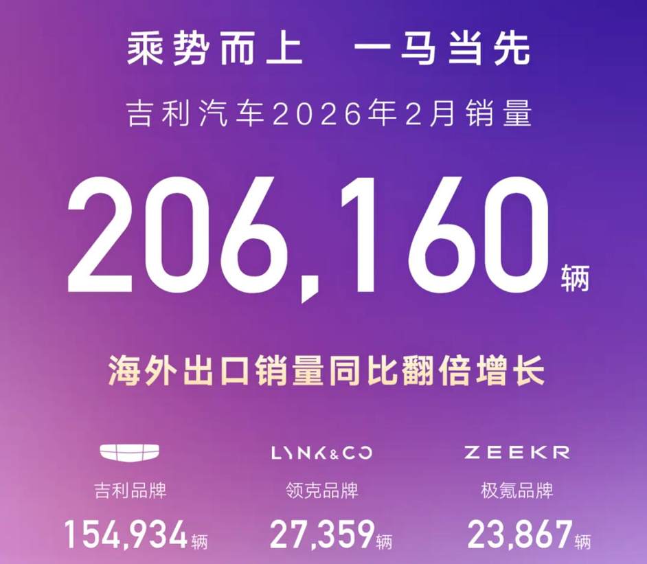 吉利汽車2月份銷量達到20.6萬輛,其中,新能源銷量達到117488輛,同比增長19%,新能源占比57%。跟其他對手相比,吉利在新能源車型上的轉型速度快出很多,而且,產品實用度高,價格與產品力都很精準。此外,它在燃油車市場的優勢繼續保持,吉利汽車將智能技術下放到不少燃油車型上,提升產品體驗感,這也是拉動銷量走高的主要原因。