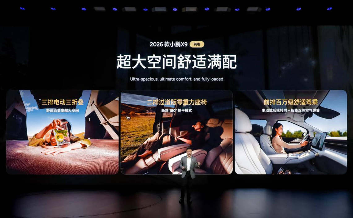 小鵬X9自上市以來,其戰略成效顯現。截至1月底,其交付量突破5萬臺,榮獲了新能源MPV銷量寶座,用實力印證了市場認可度。為了進一步鞏固其在高端純電MPV市場的優勢地位,3月2日,2026款小鵬X9純電版正式上市,售價區間為30.98-36.98萬元,作為年度改款車型,這款車在技術配置上展現出顯著的優勢,全系標配750km超長續航、5C超充+800V平臺、爆胎穩行系統等等,新車在多個方面全面煥新升級,競爭力進一步加強。