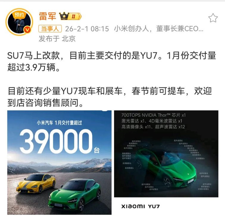 小米汽車自2024年4月啟動交付以來,截至2026年2月13日,累計交付量突破60萬臺。其中2026年1月單月交付超3.9萬臺,而主力車型YU7占比95%以上。值得注意的是,之前小米汽車只用602天就達成50萬臺交付量,成為全球新能源車企最快達成此規模的企業。