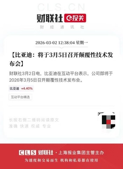 技術層面的布局同樣釋放積極信號。3月2日,比亞迪在互動平臺宣布將于3月5日舉行顛覆性技術發布會,相關消息發布后市場反應迅速,公司A股當日上漲8.36%。資本市場的反饋,顯示出投資者對企業硬核技術實力的高度認可與信心。