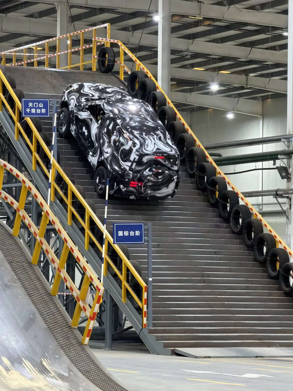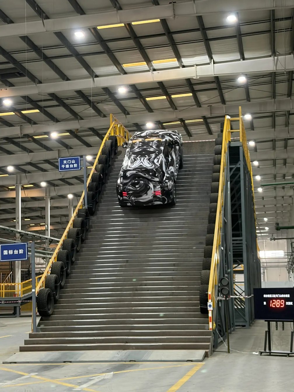 天門山天梯本就以高難度著稱,999級臺階、平均坡度超35°,單級臺階高度約18厘米,路面附著條件差,輪胎極易打滑、車輛易出現彈跳與后溜,對動力輸出、四驅控制、懸掛調校和車身剛性都是巨大挑戰。而比亞迪在廠房內采用工裝路面進行測試,相比天然巖石路面更光滑,抓地力更低,實際考驗強度甚至超過真實天門山路況,只為把每一項性能指標練到極致。