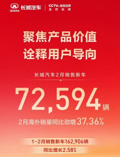 長城汽車2月份的銷量為72594輛,同比下降7%。盡管面臨挑戰(zhàn),長城汽車仍然在新能源汽車領(lǐng)域取得了不錯的成績,2月份新能源車銷量為12744輛。