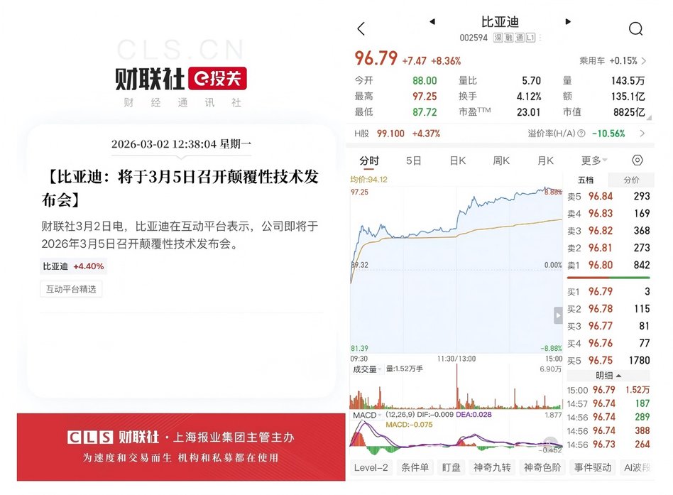 技術(shù)層面的布局同樣釋放積極信號。3月2日,比亞迪在互動平臺宣布將于3月5日舉行顛覆性技術(shù)發(fā)布會,相關(guān)消息發(fā)布后市場反應(yīng)迅速,公司A股當(dāng)日上漲8.36%。資本市場的反饋,顯示出投資者對企業(yè)硬核技術(shù)實(shí)力的高度認(rèn)可與信心。