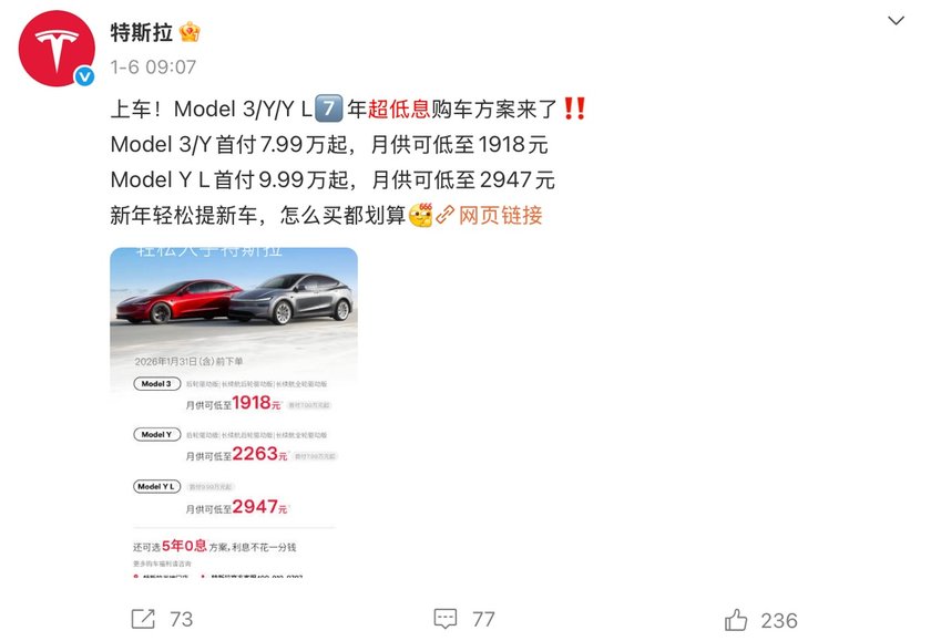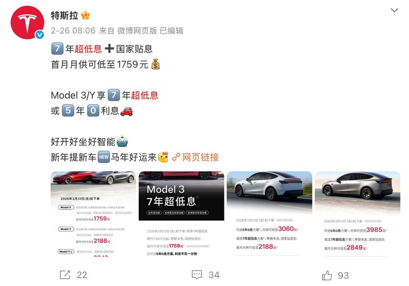 自1月6日特斯拉在中國市場率先推出“7年超低息”限時(shí)購車方案以來,國內(nèi)眾多汽車品牌相繼加入這一“金融戰(zhàn)”中。而就在2月26日,特斯拉又將這一限時(shí)購車方案延續(xù)至3月31日,全系車型不僅可享7年超低息方案,Model 3、Model Y和Model Y L三款主力車型還可選5年0息方案。