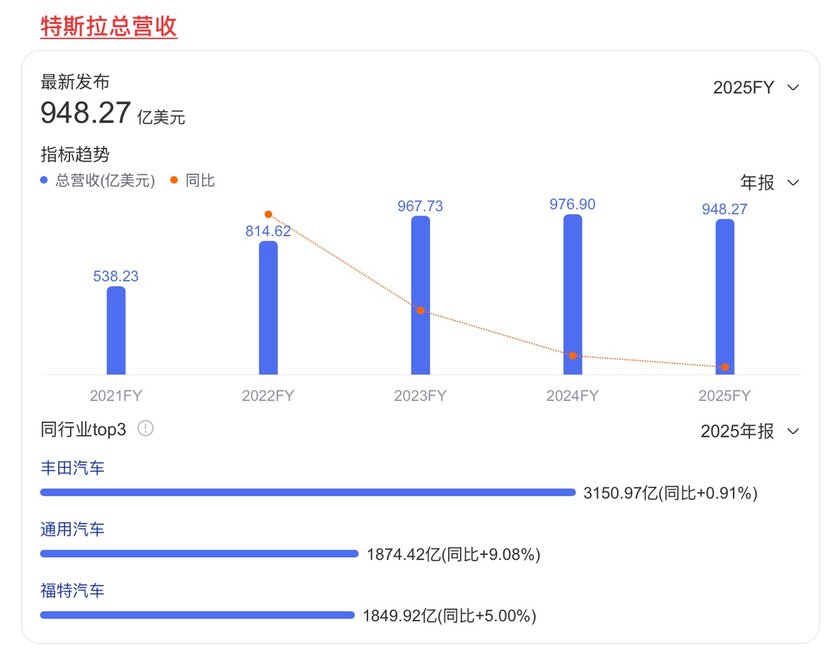 無獨(dú)有偶,2025年也是特斯拉首次出現(xiàn)年度營收下滑的年份。財(cái)報(bào)顯示,特斯拉2025年總營收約為948億美元,同比下滑3%;凈利潤約為37.94億美元,同比下滑46%。