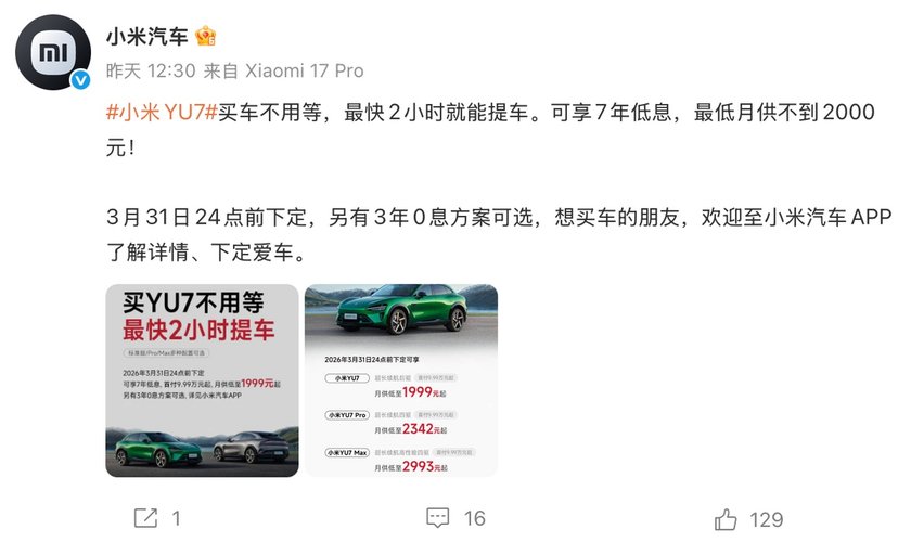 具體來看各家的政策,3月購買小米YU7可享“7年低息”,最低月供不到2000元,而且還有3年0息方案可選。