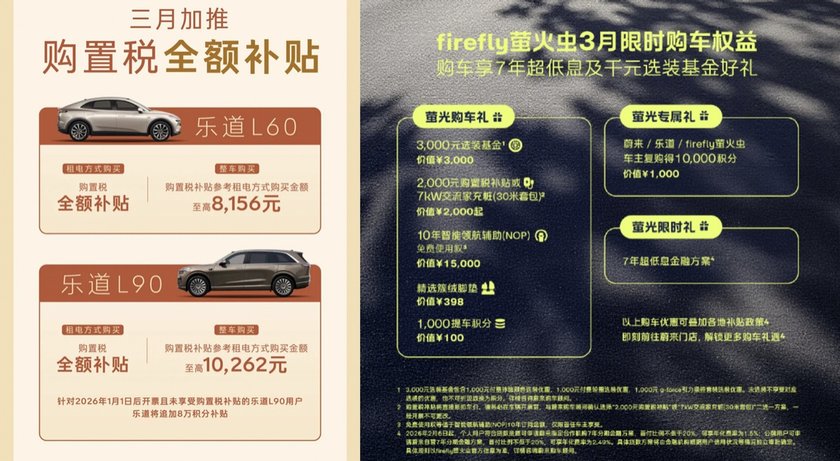 3月,蔚來品牌除了延續(xù)新ET5、ET5T、ES6和EC6的“7年超低息”金融方案后,還將全新ES8也納入其中,年化利率1.5%,同時(shí)提供1萬元的購置稅補(bǔ)貼和5年NOP+免費(fèi)使用權(quán),按380元/月的訂閱費(fèi)來算,相當(dāng)于間接省了2.28萬元。此外,樂道加推購置稅全額補(bǔ)貼,最高補(bǔ)貼10262元,螢火蟲則推出3月限時(shí)購車禮。