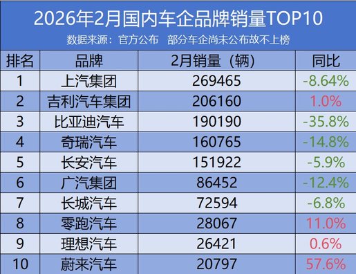 2月國內(nèi)車企銷量TOP10:三家新勢(shì)力入榜,傳統(tǒng)車企僅吉利同比增長?
